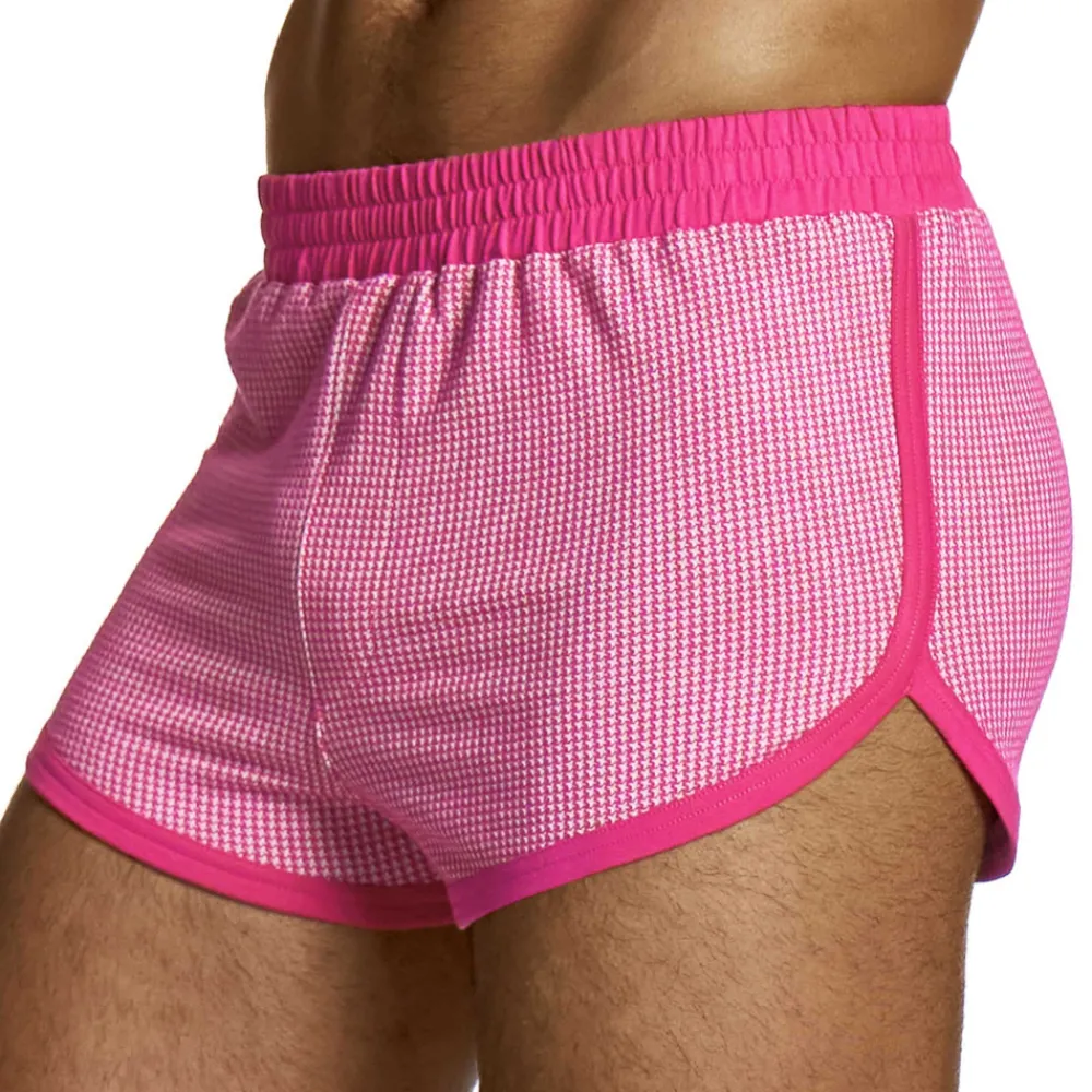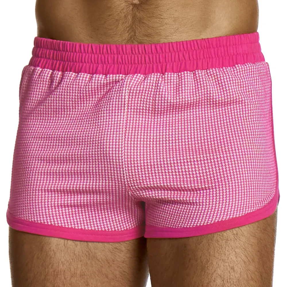 Short sexy en pur coton léger et confortable. Motif pied-de-poule. Coupe rétro, courte et échancrée sur les côtés. Bordures contrastées. Ceinture élastique recouverte. Logo MV en silicone sur la poche arrière. Braguette factice.