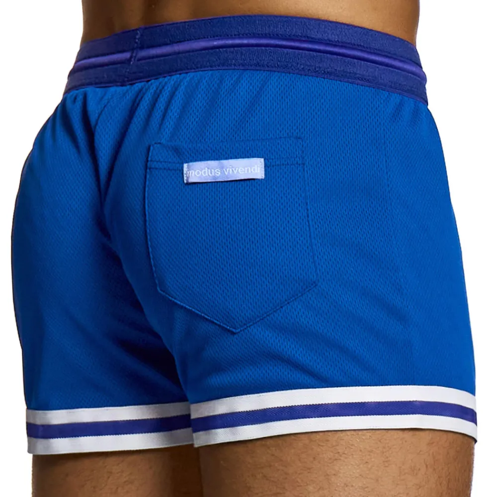 Short court en mesh sport doublé, respirant et confortable. Poche arrière avec étiquette Modus Vivendi. Braguette factice. Triple bande sport à la bordure des cuisses. Ceinture élastique texturée.