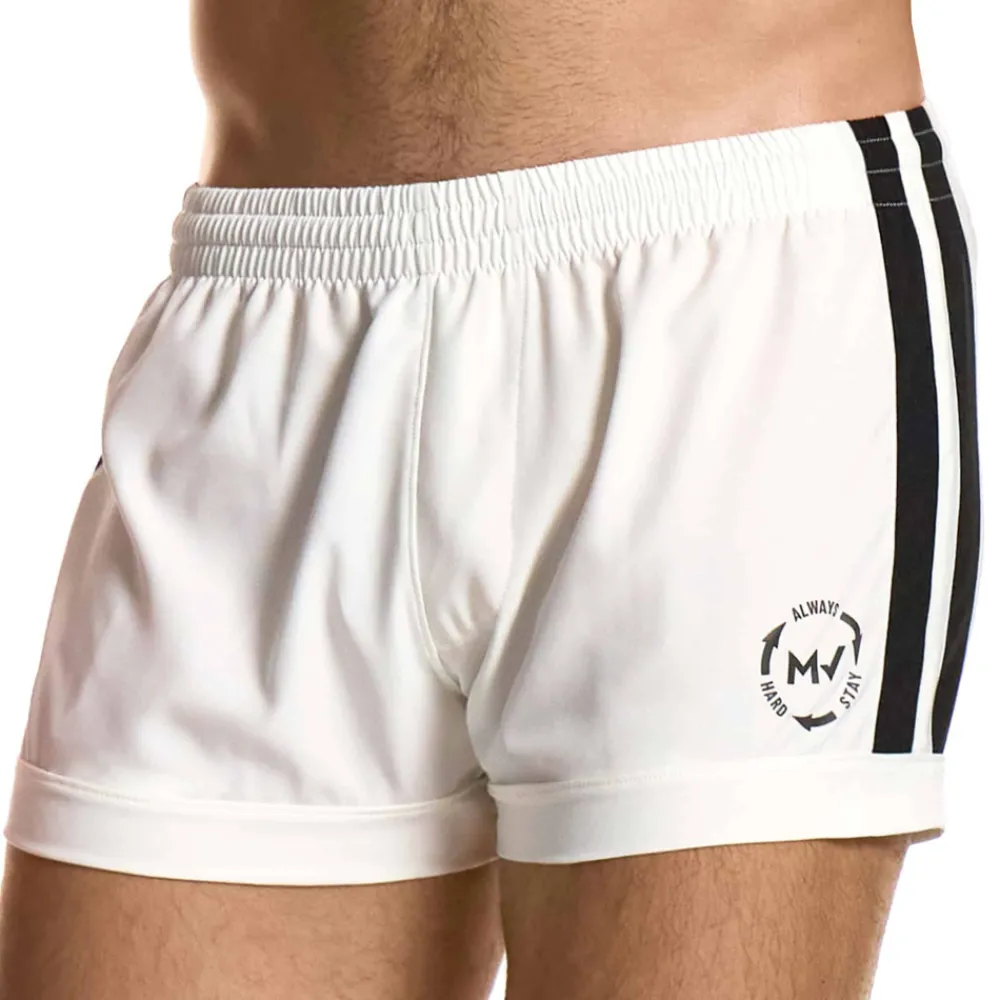 Short de sport en microfibre extensible et respirante. Matière douce au toucher, séchant rapidement et évacuant rapidement l’humidité. Double bande latérale sport de couleur contrastée. Poche arrière. Ceinture élastique avec cordon de serrage intérieur. Logo MV « Always Stay Hard » sur la cuisse gauche.