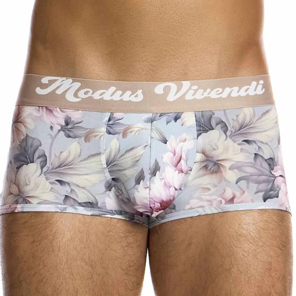 Boxer sexy et élégant en microfibre extensible très douce et soyeuse. Imprimé floral romantique et délicat de couleur pâle. Coupe taille basse et ajustée. Poche frontale non doublée. Ceinture élastique en jacquard signée Modus Vivendi.
