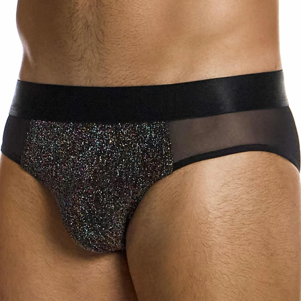 Slip glamour combinant tulle transparent et microfibre tricotée avec des fils métallisés présentant des reflets multicolores. Ceinture élastique signée Modus Vivendi.
