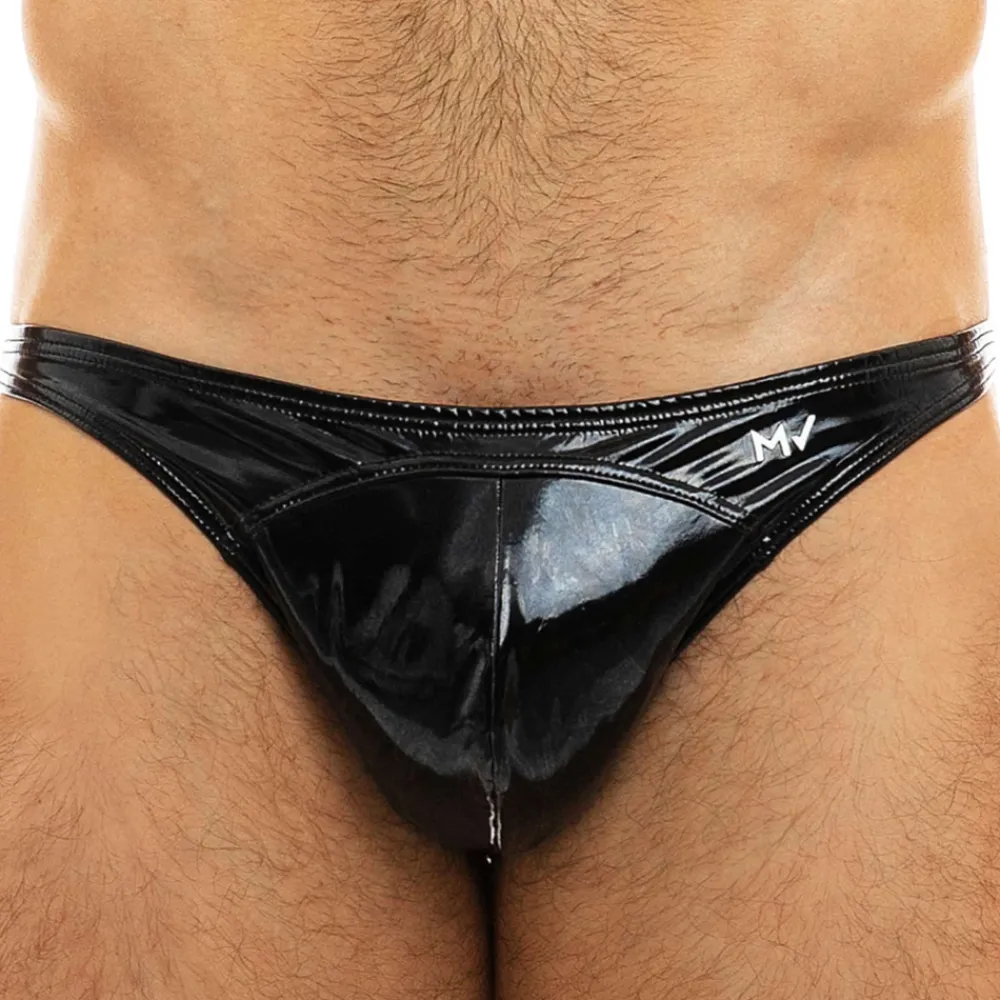 Slip ultra taille basse en vinyle brillant pour un look fetish. Fine ceinture élastique recouverte. Logo MV en relief devant et derrière.