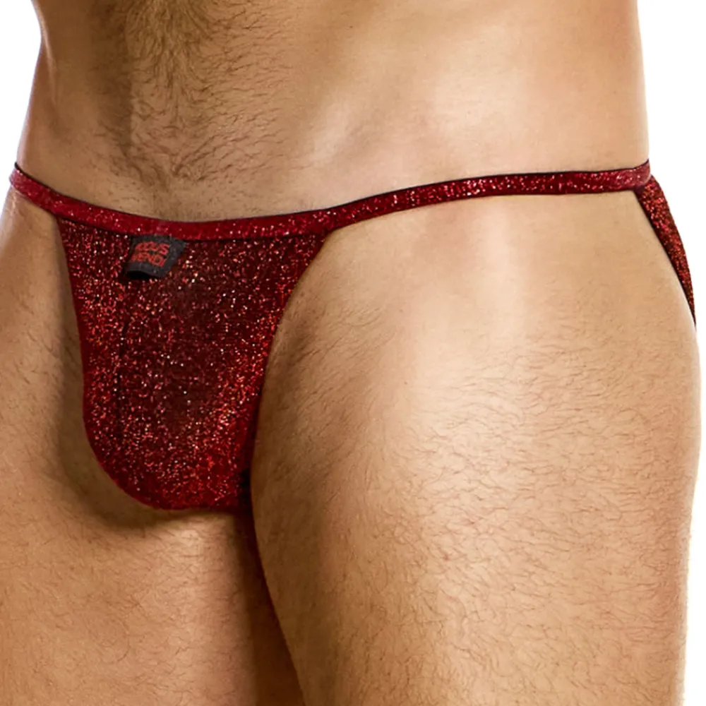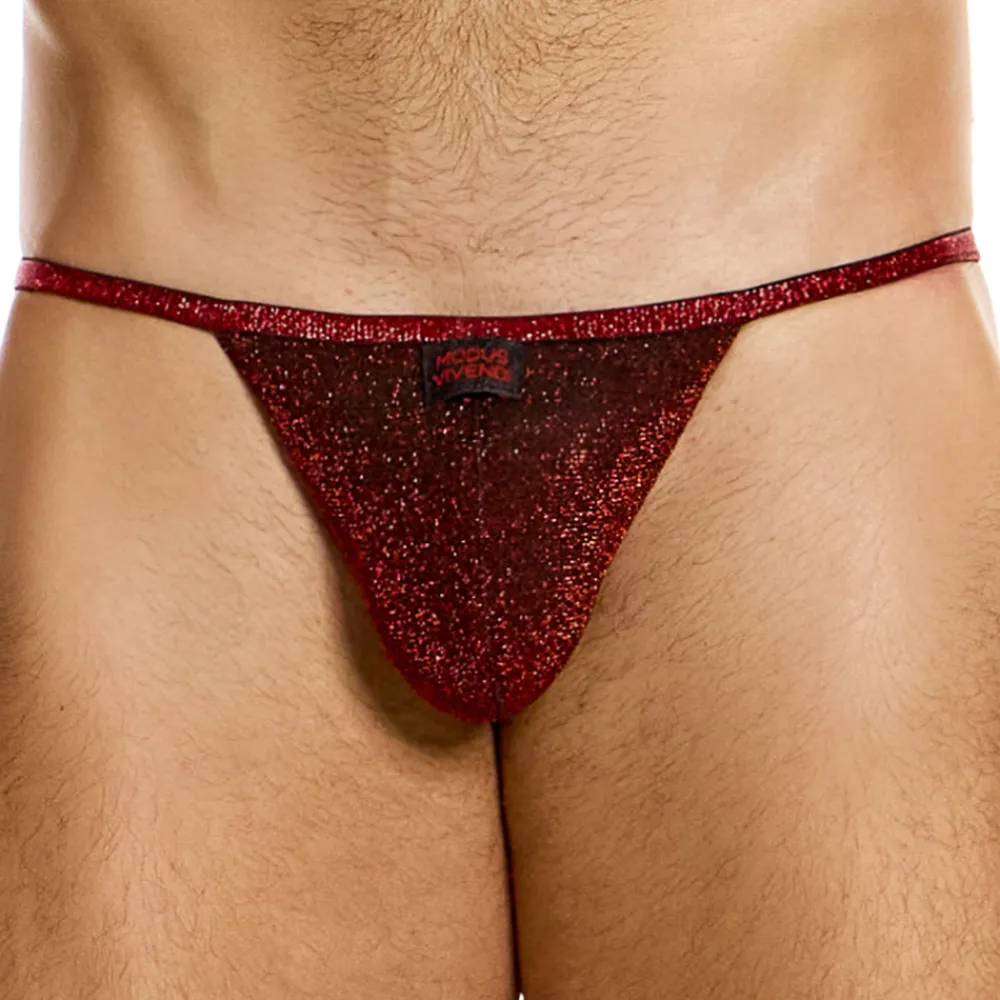 Slip très glamour en microfibre tricotée avec des fils de Lurex qui lui confèrent un aspect métallique brillant. Coupe tanga taille basse. Fine ceinture élastique scintillante.