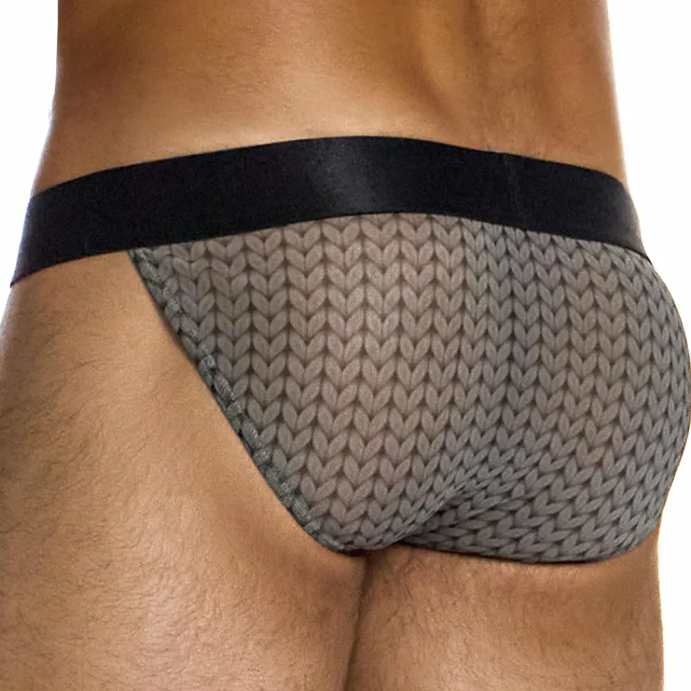 Slip sexy et original en résille fine, légère et semi-transparente. Impression en trompe-l’œil créant l’illusion d’un tissu tricoté. Coupe tanga taille basse. Poche frontale doublée. Ceinture élastique satinée signée Modus Vivendi.