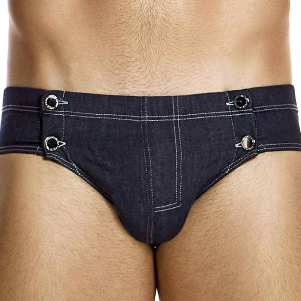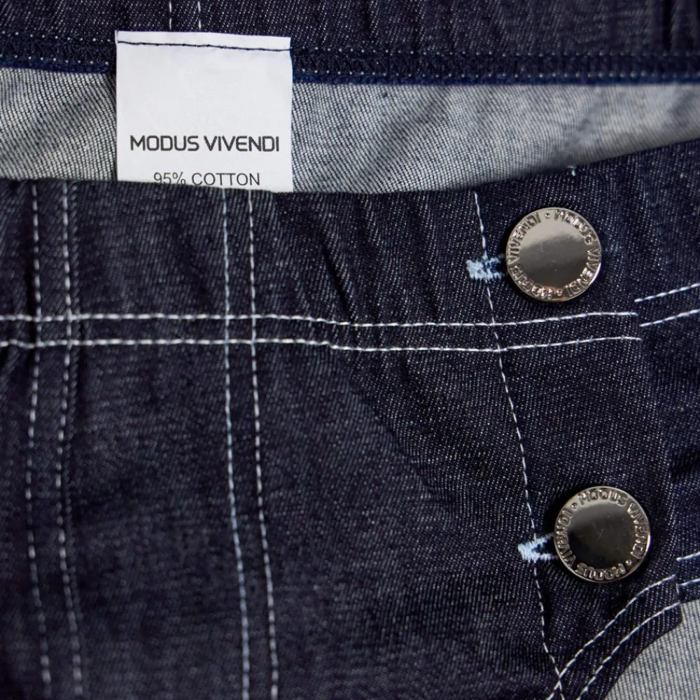 Slip sexy et original en véritable jean stretch brut. Coupe taille basse rétro, dotée de 4 boutons fonctionnels à l’avant pour un accès direct à l’essentiel. Surpiqûres contrastées. Braguette factice. Ceinture élastique recouverte avec étiquette Modus Vivendi argentée cousue à l’arrière. Note : la couleur s’estompe à l’usage. Laver séparément.