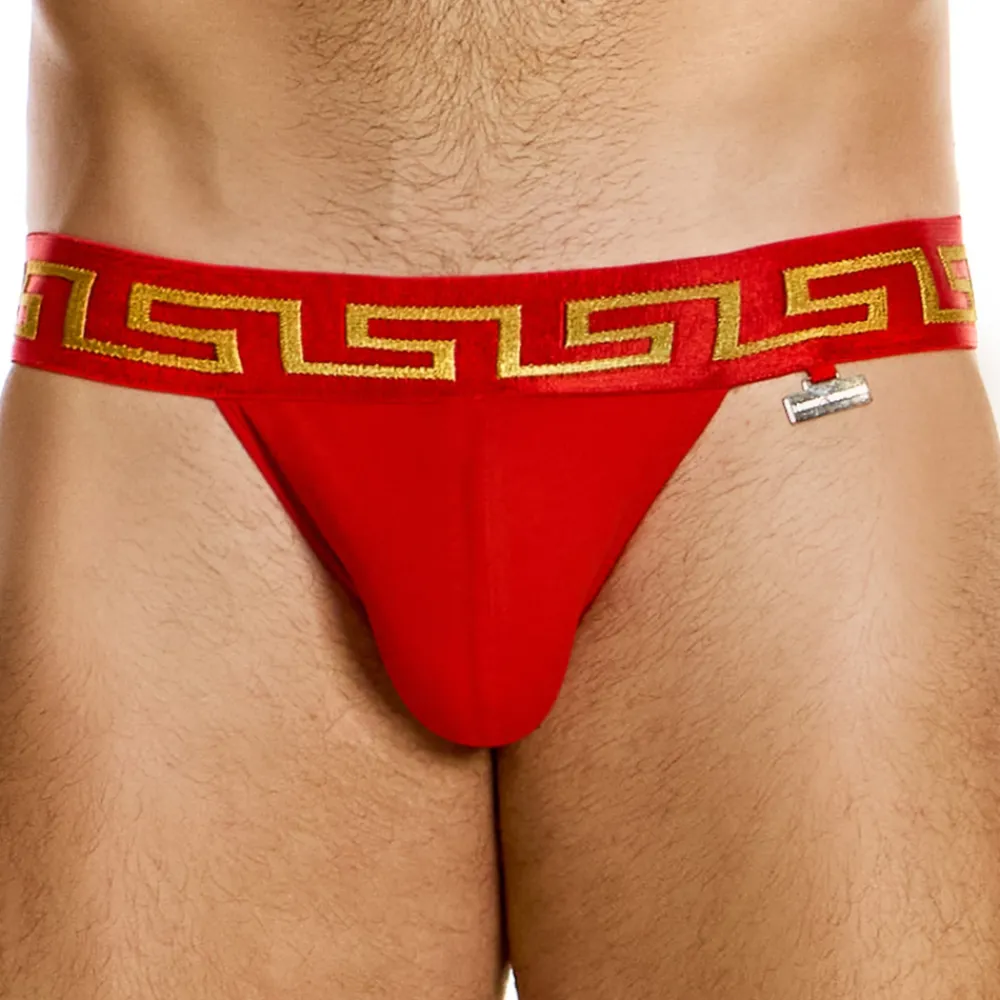 Slip taille basse en coton doux. Coupe tanga très sexy. Poche frontale doublée pour plus de confort. Plaque métallique Modus Vivendi sur la hanche gauche. Motif inspiré par la Grèce antique sur la ceinture élastique.