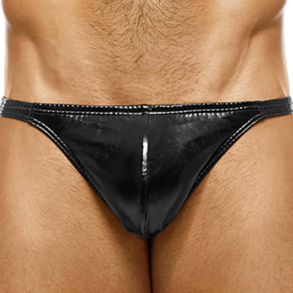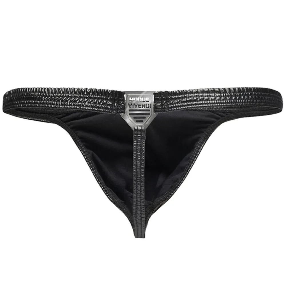 String ultra sexy en matière lisse et brillante imitant le latex. Plaque métallique avec logo découpé en haut des fesses. Poche frontale non doublée. Ceinture élastique fine.