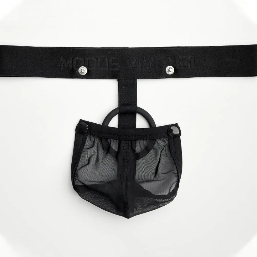 String ultra sexy et provocant intégrant un cock ring en gomme (diamètre interne 5,5 cm). Grande poche frontale en résille transparente amovible par 3 boutons-pression. Ceinture élastique signée Modus Vivendi ton-sur-ton.