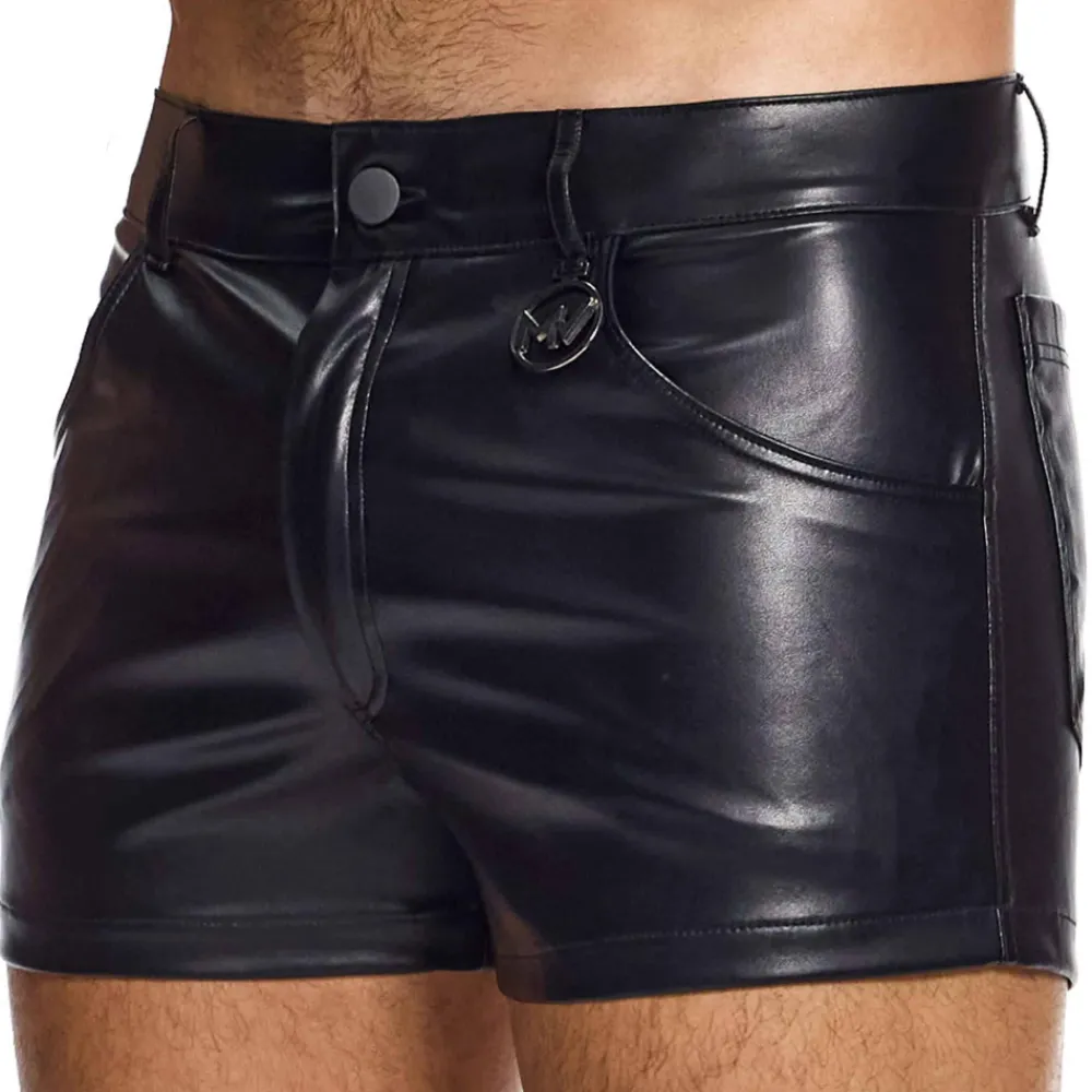 Short en microfibre imitant le cuir. Coupe slim taille basse. 5 poches. Braguette à bouton et fermeture Eclair. 5 passants de ceinture. Plaque métalique Modus Vivendi sur la hanche gauche.