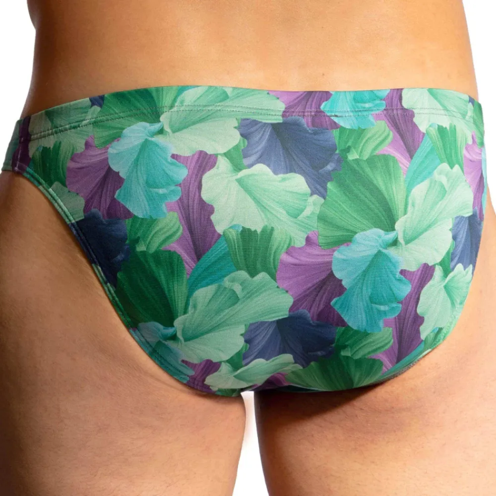 Slip taille basse en microfibre extensible, douce et légère. Imprimé feuillages abstrait dans les tons verts et violets. Coupe simple, élégante et très confortable. Etiquette Olaf Benz cousue sur la fine ceinture élastique.