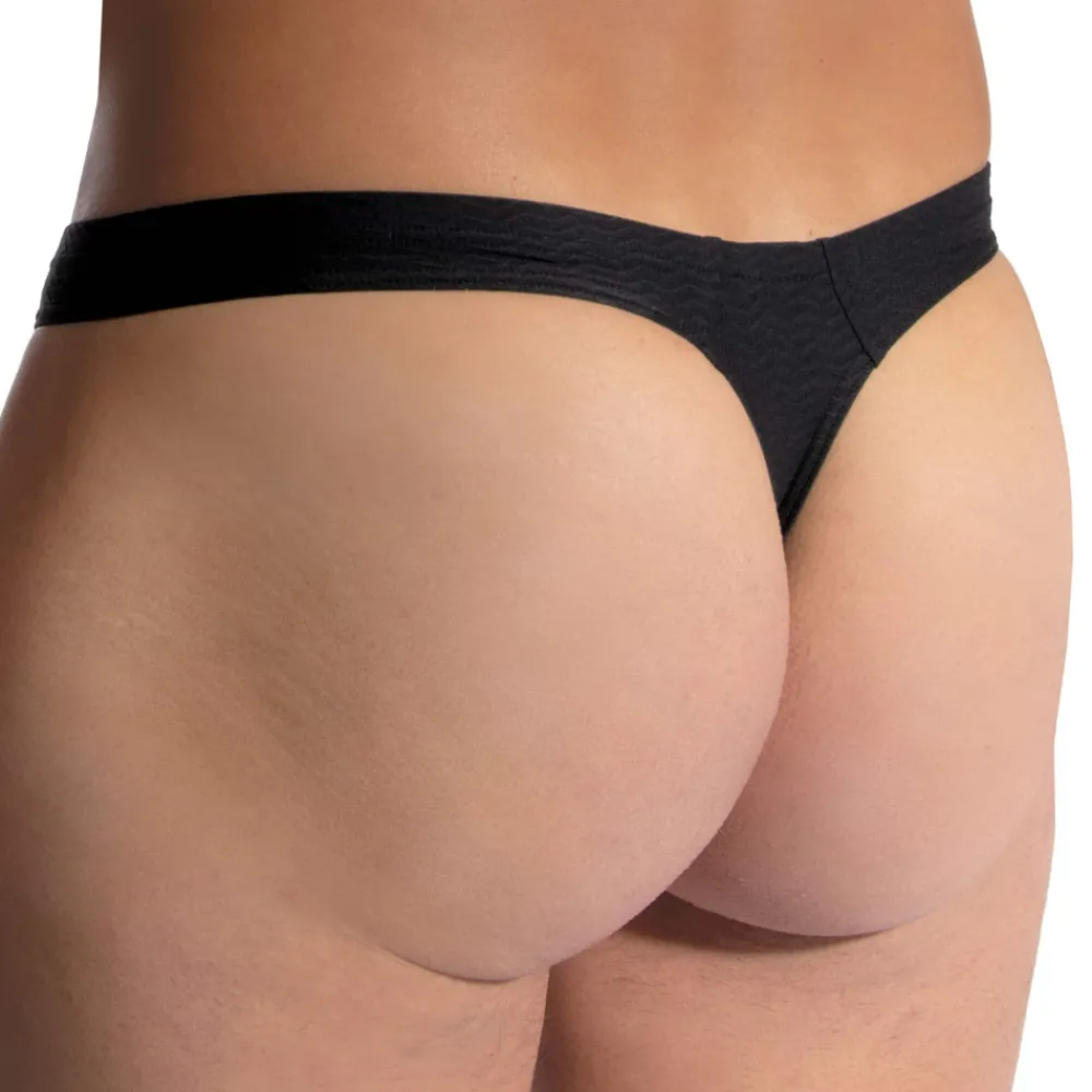 String minimaliste et très élégant en microfibre extensible, douce et légère. Motif ondulé ton-sur-ton en relief. Coupe sexy et confortable. Fine ceinture élastique recouverte avec étiquette Olaf Benz.