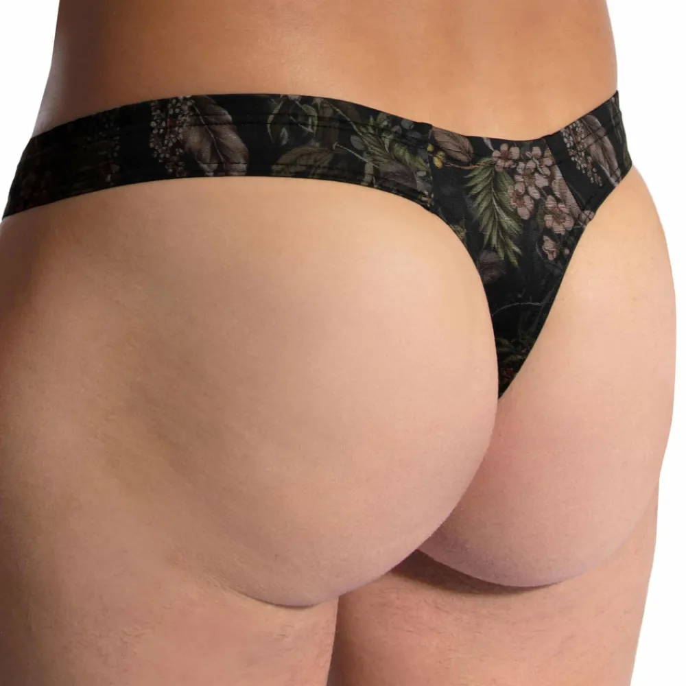 String minimaliste et très élégant en microfibre très douce et légère. Imprimé floral sur fond noir. Coupe simple, sexy et confortable. Etiquette Olaf Benz cousue sur la fine ceinture élastique recouverte.