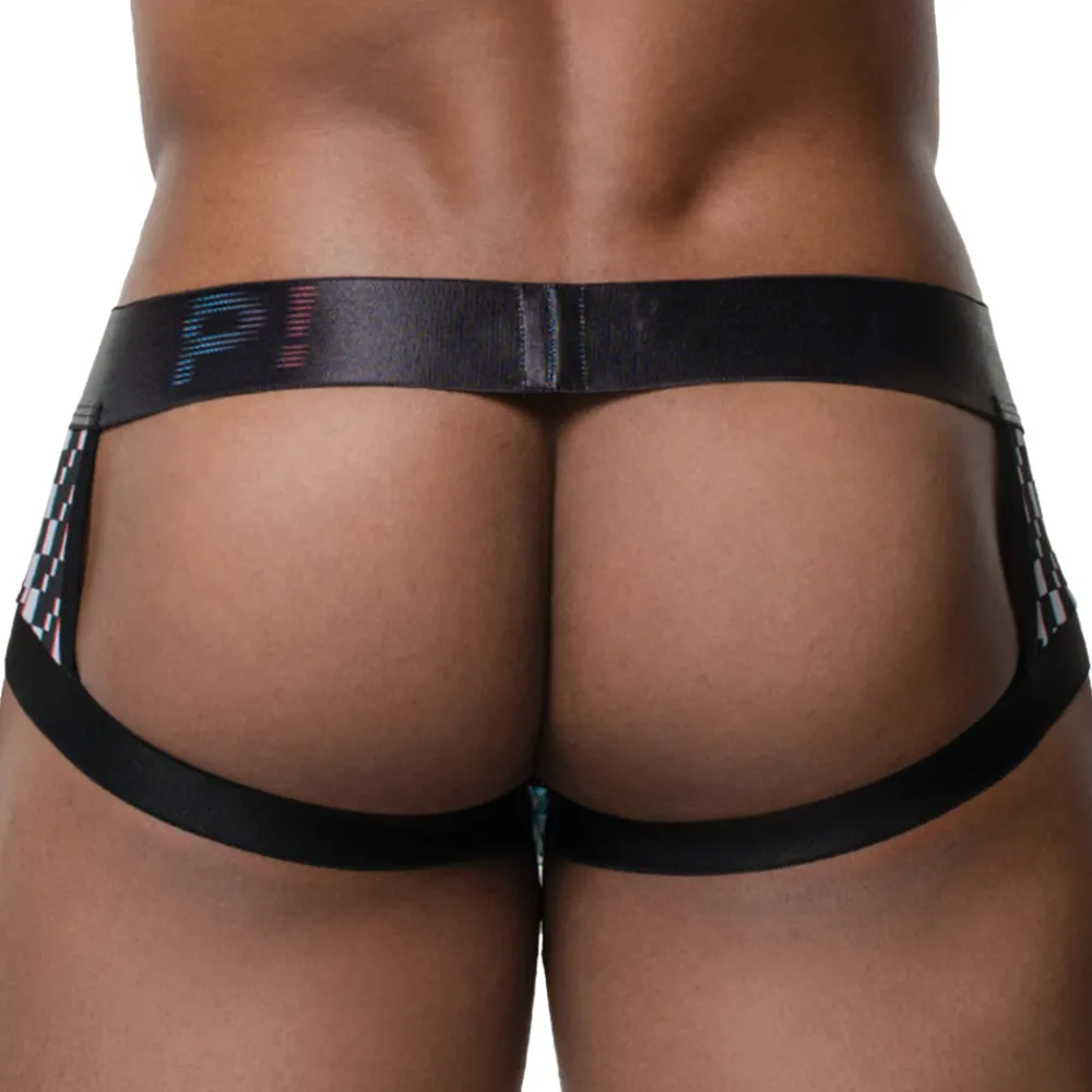 Shorty en coton CoolTouch offrant une sensation de fraîcheur au contact de la peau. L’arrière a été découpé, à la manière d’un jockstrap, afin d’offrir une totale liberté de mouvement. Tissu doux et extensible pour un confort optimal. Imprimé à carreaux noir et blanc rappelant les pixels d’un écran. Détails de couleur contrastée. Poche frontale doublée. Ceinture élastique signée Pump!.