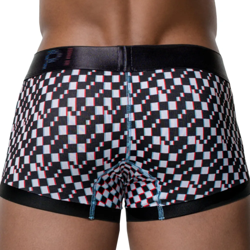 Boxer en coton CoolTouch offrant une sensation de fraîcheur au contact de la peau. Tissu doux et extensible pour un confort optimal. Imprimé à carreaux noir et blanc rappelant les pixels d’un écran. Détails de couleur contrastée. Poche frontale doublée Ceinture élastique signée Pump!.