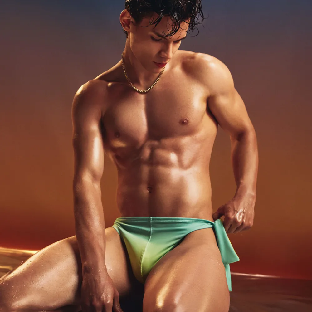 Slip de bain taille basse en microfibre extensible, douce et lisse. Design original avec nouage ajustable sur le côté gauche pour un maintien très confortable. Imprimé dégradé et grand logo PUMP! à l’arrière. Tissu de grande qualité avec protection solaire UPF 50+, haute résistance à la décoloration et séchage rapide. Entièrement doublé.