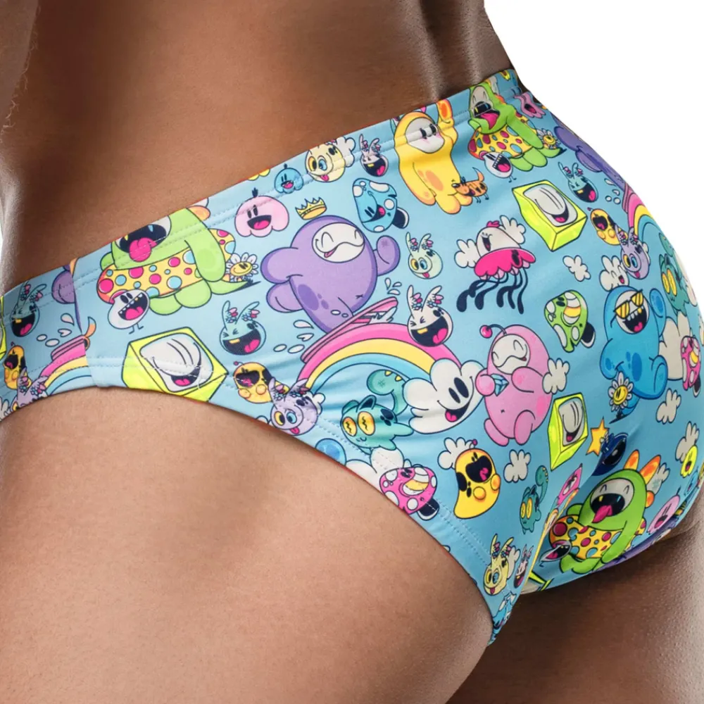 Slip de bain doux et confortable en microfibre stretch recyclée à partir de bouteilles en plastique. Illustration de personnages de cartoon multicolores. Coupe bikini taille basse super ajustée. Tissu de grande qualité avec protection solaire UPF 50+. Poche frontale doublée.