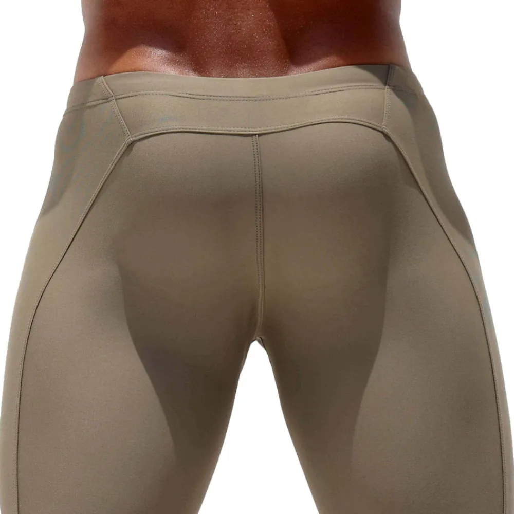 Legging 3/4 en microfibre extensible de qualité supérieure. Tissu à mémoire de forme évacuant rapidement la transpiration. Bandes latérales contrastées qui enveloppent les hanches et se terminent au niveau des genoux. Logo Rufskin sur le mollet gauche. Braguette factice. Ceinture élastique avec cordon de serrage intérieur. Fabriqué en Californie.