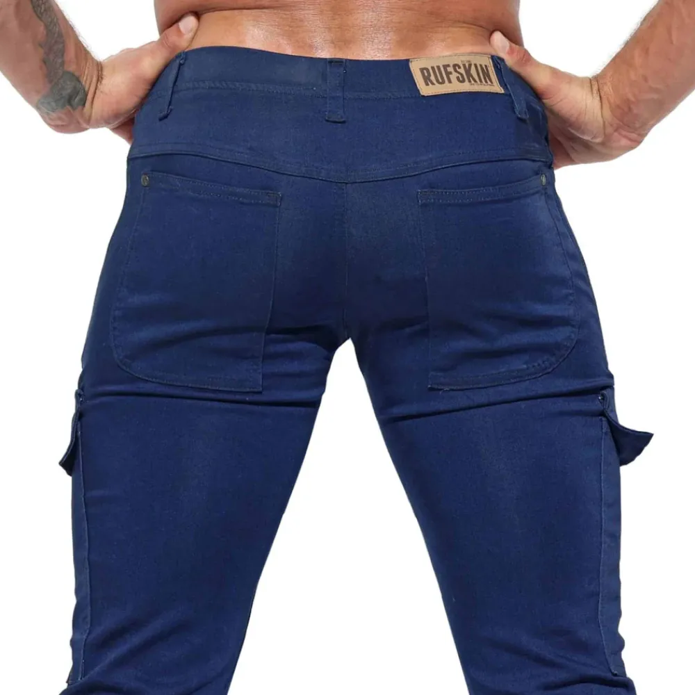 Pantalon cargo en denim stretch légèrement satiné. Coupe slim près du corps. Les lignes incurvées – caractéristiques de la marque – mettent en valeur votre fessier. 7 poches dont 2 plaquées avec rabat sur les cuisses. Ceinture élastique avec passants. Braguette factice. Etiquette Rufskin. Rivets métalliques. Fabriqué en Californie.
