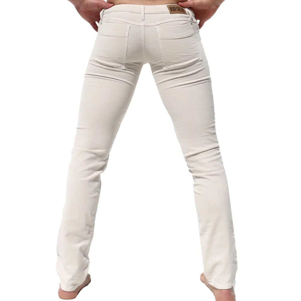 Pantalon stretch taille basse en coton doux façon velours côtelé. Coupe slim très près du corps. Les lignes incurvées sur les poches arrières – caractéristiques de la marque – mettent en valeur votre fessier. Braguette à boutons. Rivets métalliques Rufskin. 5 poches. Etiquette Rufskin à l’arrière.