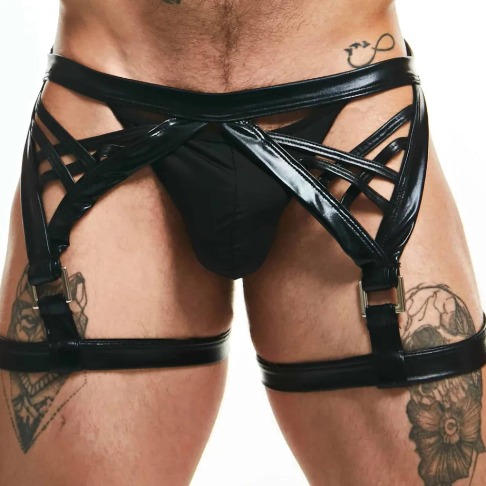Jarretière ultra provocante constituées de bandes élastiques croisées recouvertes de microfibre brillante. 2 anneaux métalliques. Le string porté en dessous sur la photo n’est pas inclus.