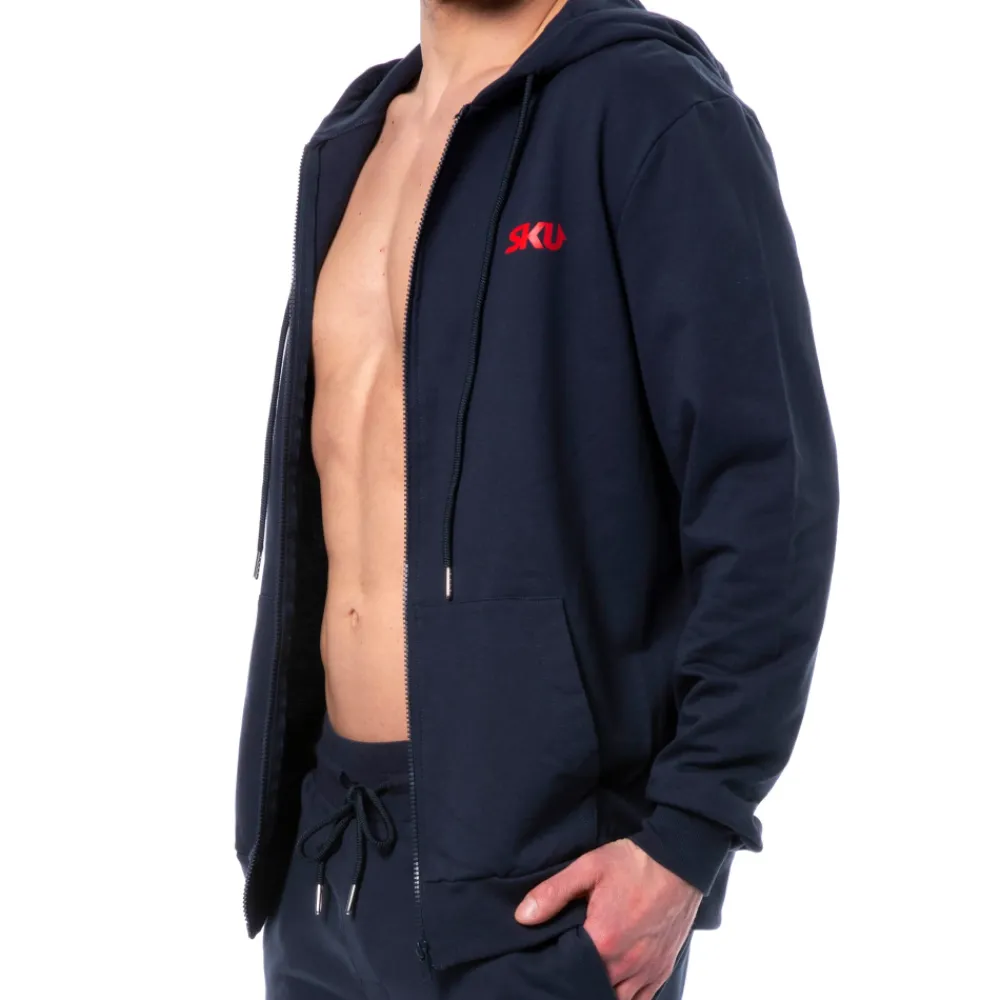 Veste sport en pur coton très doux et confortable. Coupe décontractée. Capuche avec cordon de serrage. Manches longues. 2 poches. Fermeture Eclair intégrale. Bandes élastiquées à la taille et aux poignets. Logo SKU de couleur contrastée sur la poitrine. Pantalon vendu séparément.