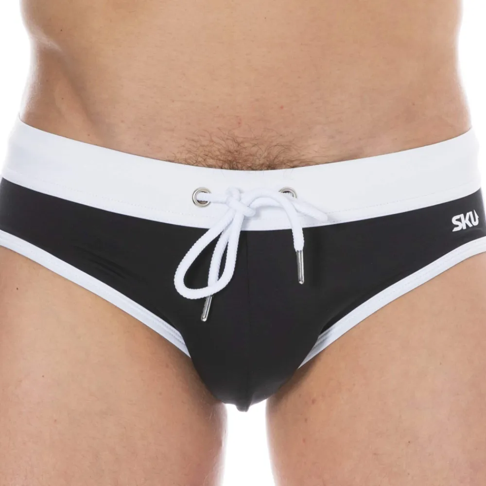 Slip de bain sport en microfibre séchant rapidement. Coupe taille basse très ajustée. Poche frontale doublée. Bordures de couleur contrastée. Logo SKU imprimé sur la cuisse gauche. Ceinture élastique avec cordon de serrage.