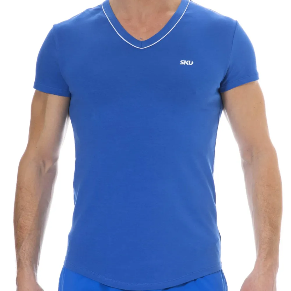 T-shirt sport et sexy en coton premium doux et extensible de couleur intense. Cintré juste comme il faut, il valorisera votre musculature sans gêner vos mouvements. Coupe courte et arrondie en bas, pour tomber parfaitement sur un pantalon. Le col en V est subtilement souligné par un liseré de couleur contrastée. Logo SKU sur la poitrine.