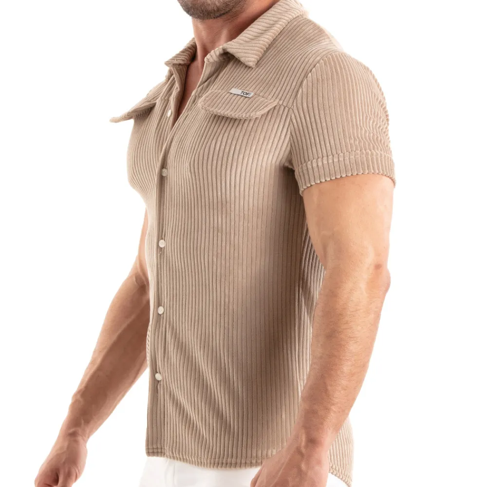 Chemise cintrée tricotée en velours côtelé pour un style rétro chic. Manches courtes. Deux poches à rabat. Logo TOF Paris sur la poitrine. Fabrication française.
