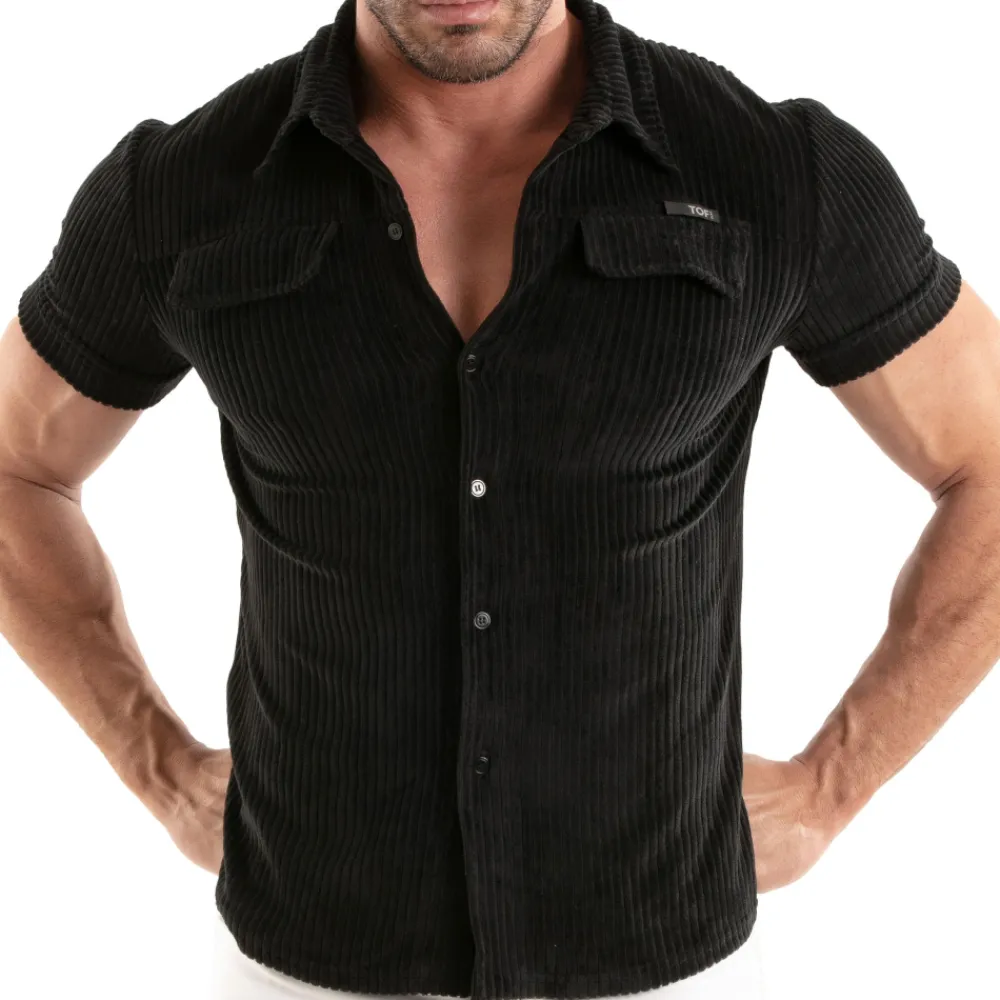 Chemise cintrée tricotée en velours côtelé pour un style rétro chic. Manches courtes. Deux poches à rabat. Logo TOF Paris sur la poitrine. Fabrication française.