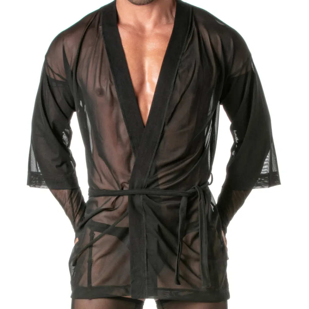 Kimono provocant en résille extensible et transparente. Manches 3/4. Passants et ceinture à la taille. Fabrication française.