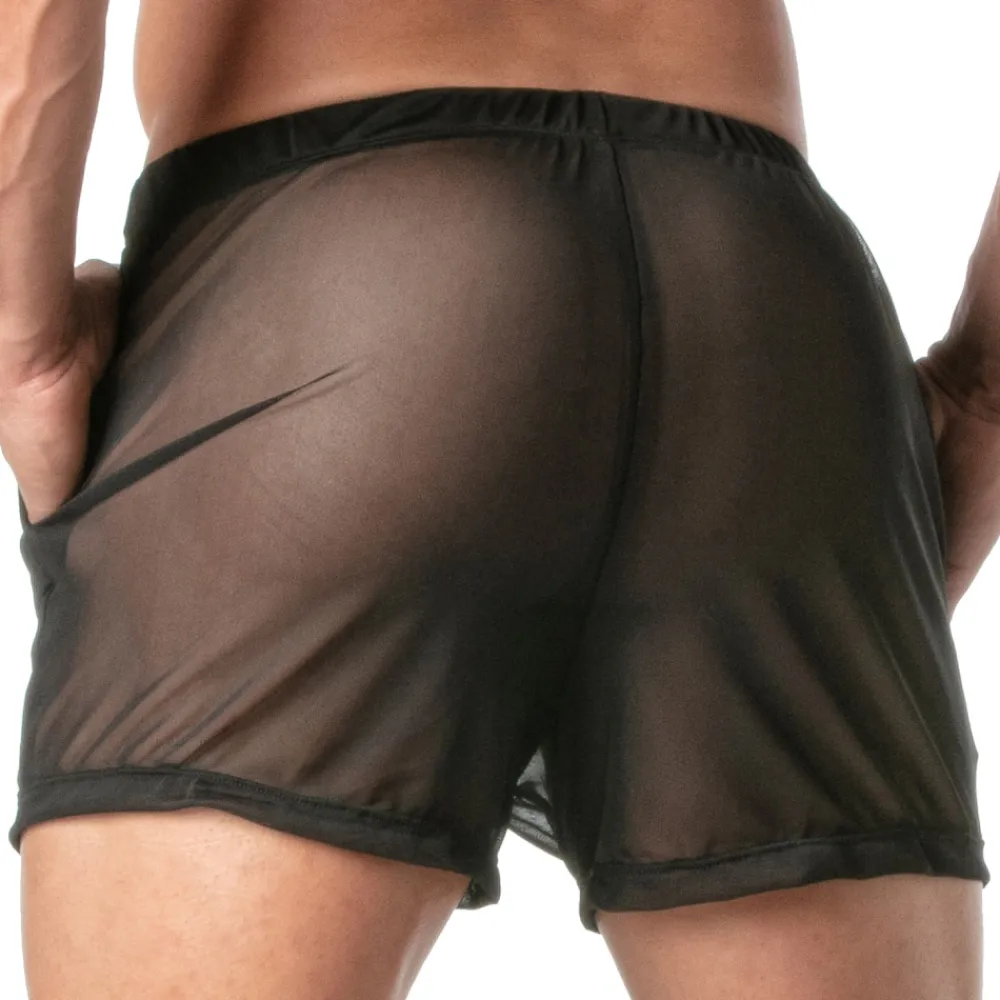 Short provocant en résille extensible et transparente. Coupe taille basse, ample et confortable. 2 poches. Braguette factice. Ceinture élastique recouverte avec étiquette TOF Paris. Fabrication française.