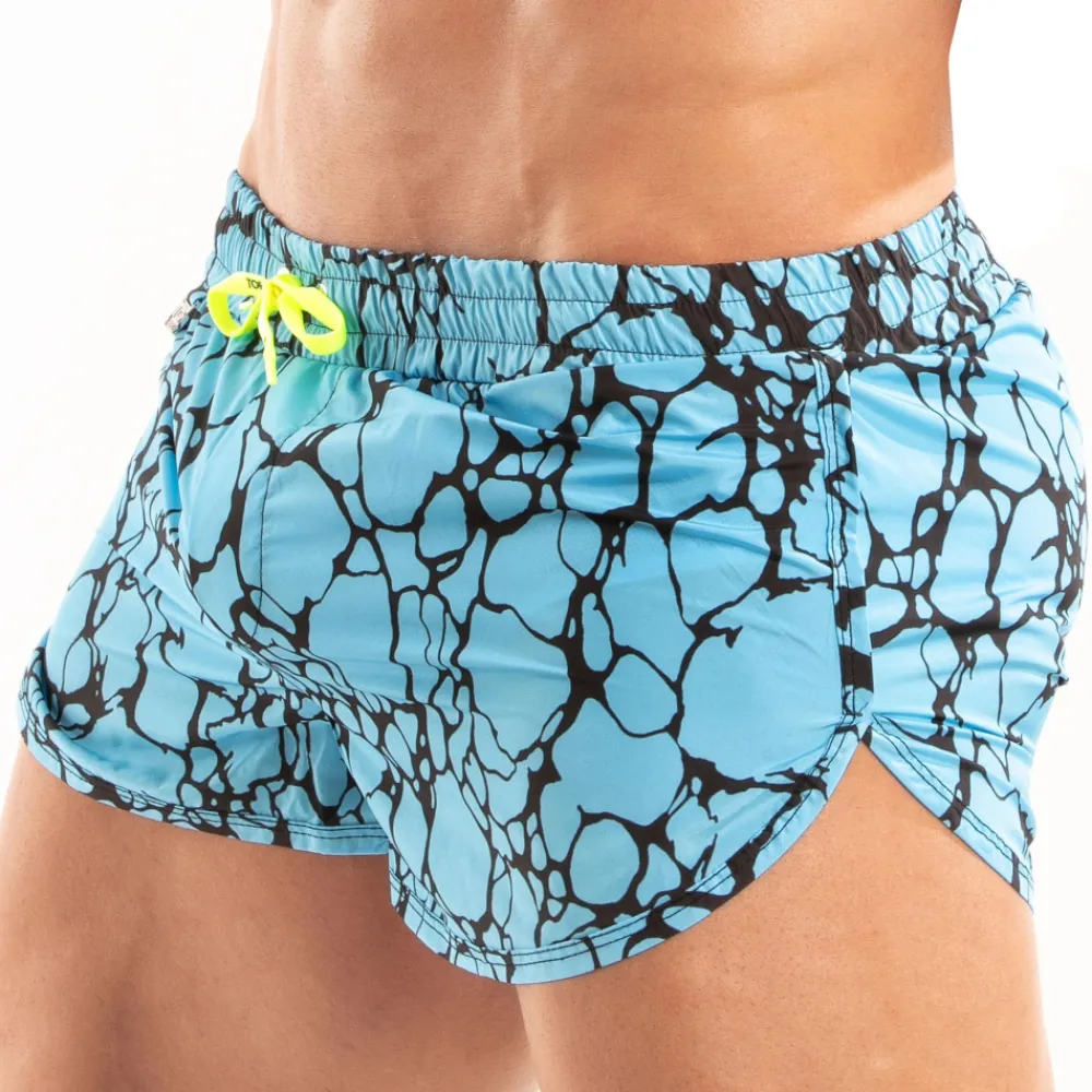 Short de bain taille basse très confortable en microfibre douce et légère, séchant rapidement. Coupe courte très ajustée. Imprimé bleu évoquant les reflets de l’eau dans la piscine. Plaque métallique TOF Paris. Braguette factice. Poche arrière. Slip intérieur en mesh. Ceinture élastique avec cordon de serrage de couleur fluo. Fabrication française.