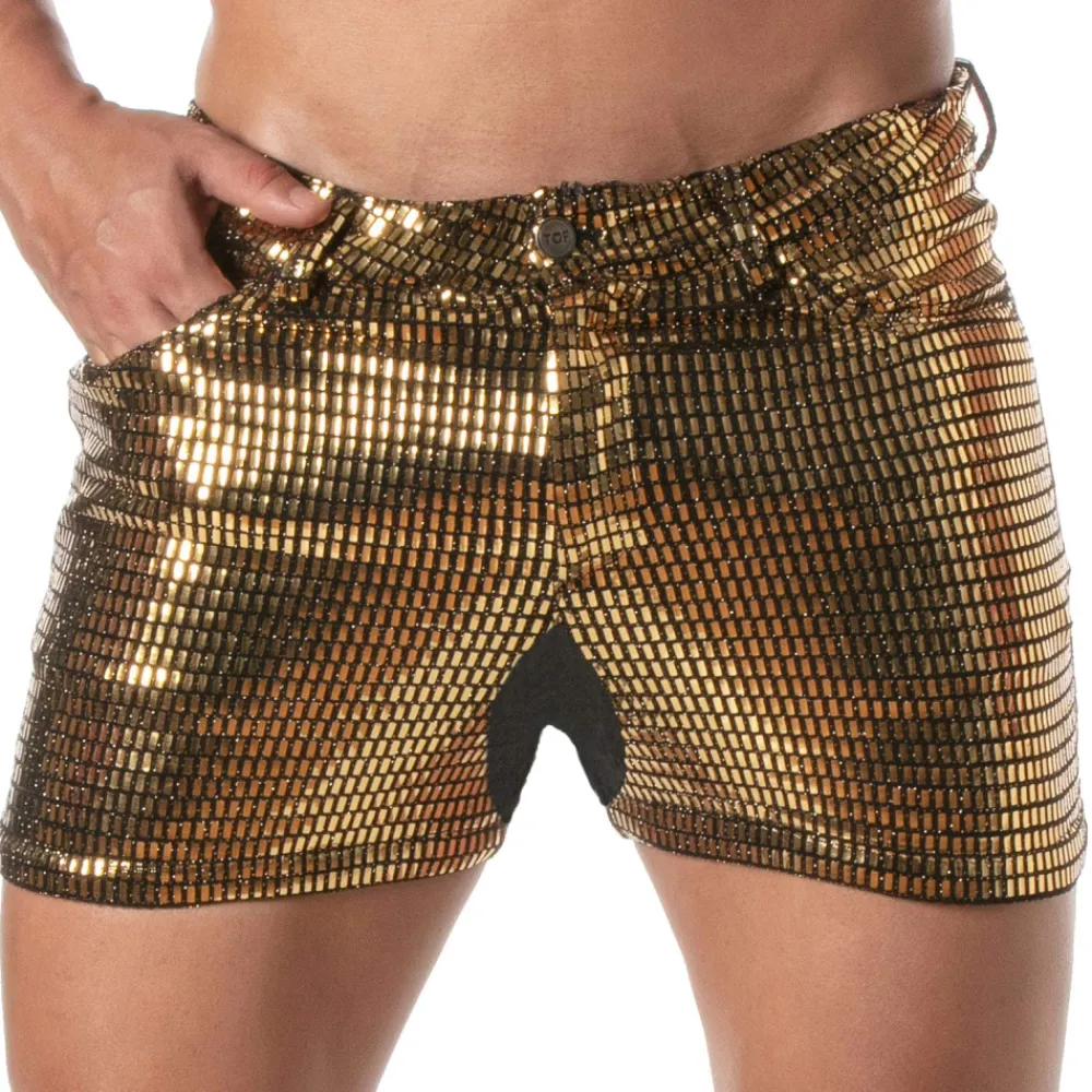 Short en microfibre recouverte de carreaux scintillants pour un effet boule à facette. Coupe taille basse et ajustée. 5 poches. Braguette à bouton et fermeture Eclair. Passants de ceinture. Renfort à l’entrejambe. Fabrication française. Conseils d’entretien : laver à la main, ne pas sécher en machine, ne pas repasser.