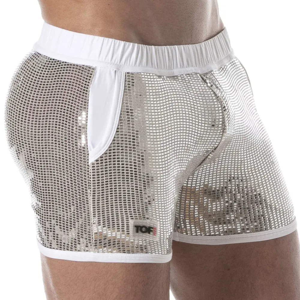 Short en microfibre recouverte de carreaux scintillants pour un effet boule à facette. Bordures contrastées. 2 poche. Logo TOF en silicone sur la cuisse droite. Ceinture élastique recouverte. Fabrication française. Conseils d’entretien : laver à la main, ne pas sécher en machine, ne pas repasser.