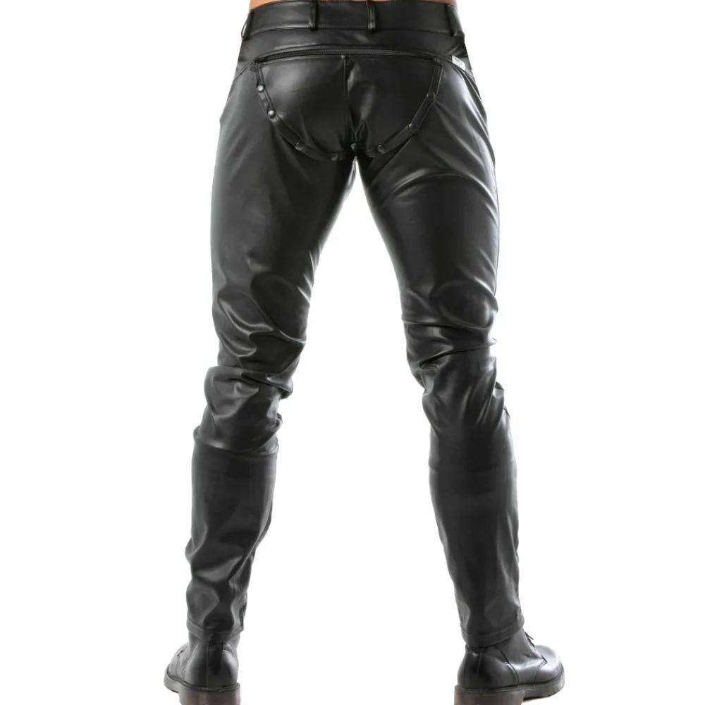 Pantalon sexy en simili-cuir extensible pour un look fetish. Empiècement détachable sur les fesses grpace à une fermeture Eclair et des boutons-pression. 3 poches. Braguette à boutons et fermeture Eclair. Passants de ceinture. Fabrication française.