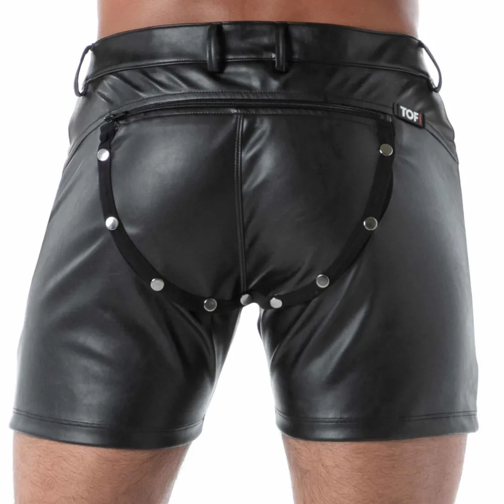 Short sexy et provocant en simili-cuir extensible pour un look fetish. Empiècement détachable sur les fesses grâce à une fermeture Eclair et des boutons-pression. 3 poches. Braguette à boutons et fermeture Eclair. 6 passants de ceinture. Fabrication française. Conseils d’entretien : laver à 30°, ne pas sécher en machine, ne pas repasser.