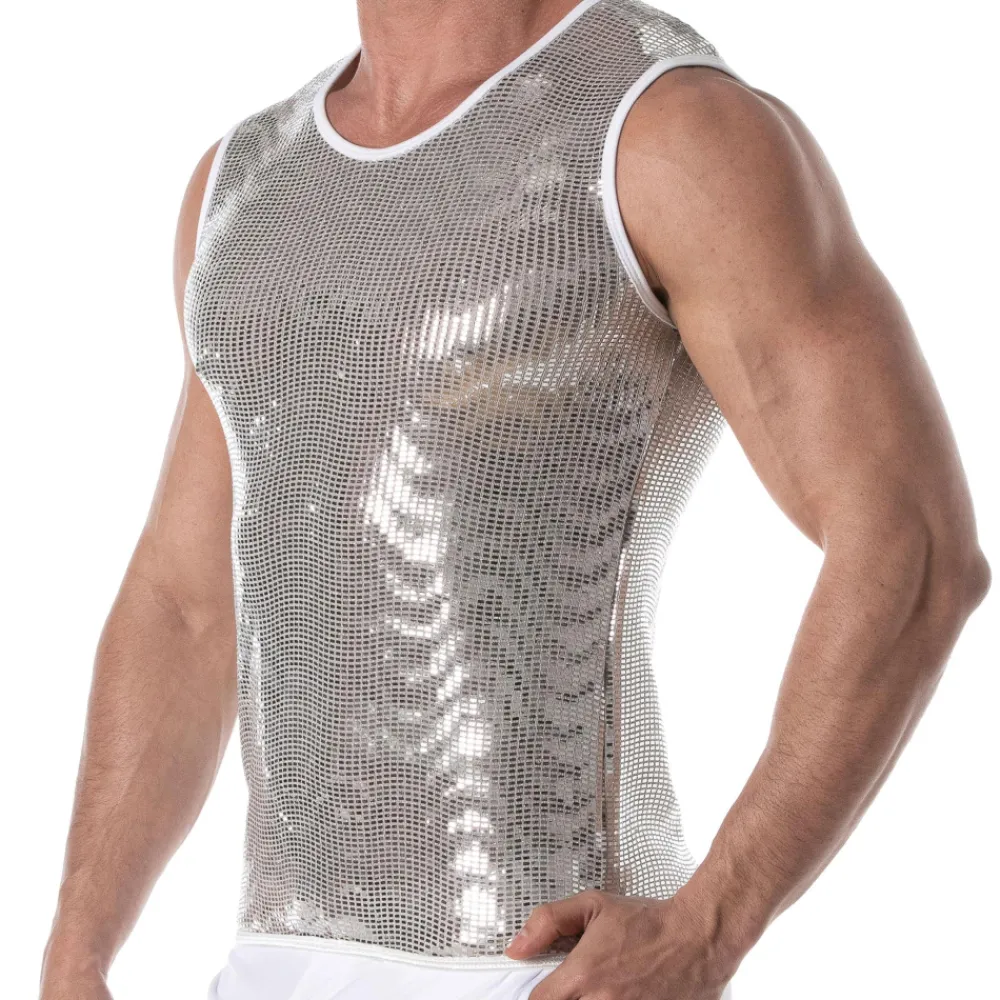 Débardeur sexy en microfibre recouverte de carreaux scintillants pour un effet boule à facette. Bordures contrastées. Col rond. Logo TOF Paris sur la poitrine. Fabrication française. Conseils d’entretien : laver à la main, ne pas sécher en machine, ne pas repasser.