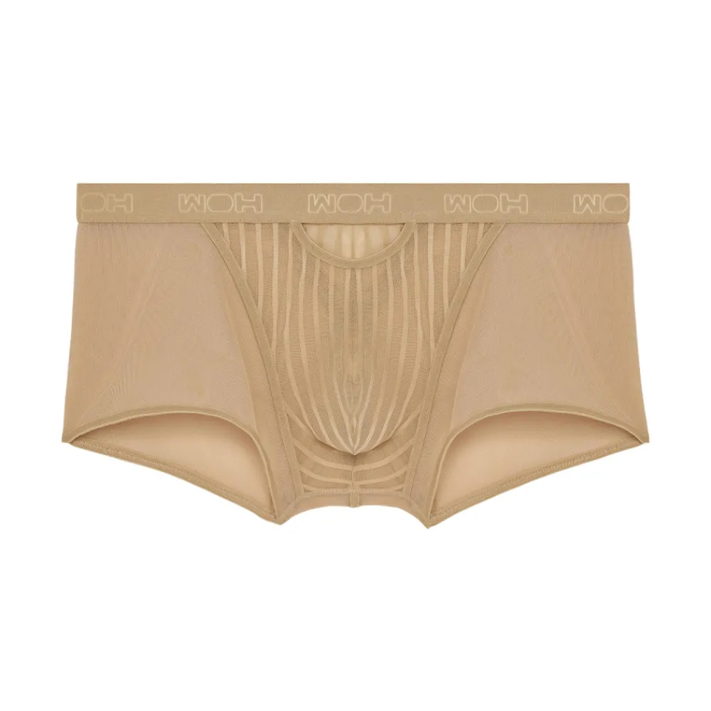 Boxer sexy et élégant en résille fine et luxueuse. Alternance de rayures verticales opaques et transparentes sur la poche frontale et le haut des fesses. Ouverture provocante au-dessus de la poche. Fine ceinture élastique signée WOH.