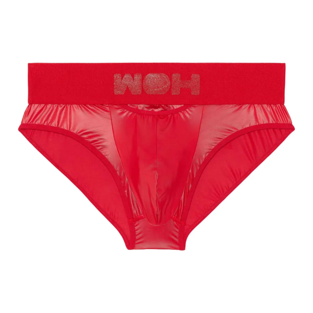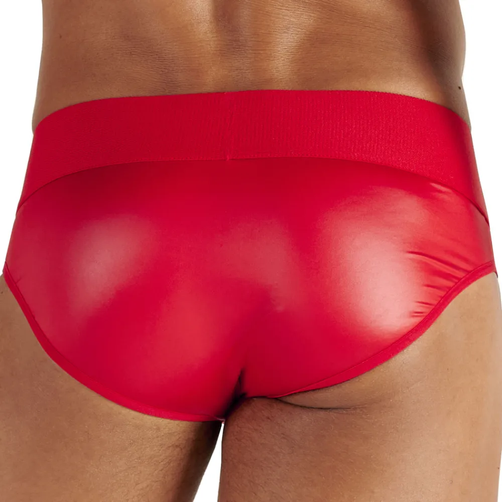 Slip sexy et provocant en microfibre extensible imitant le cuir, pour un look fétichiste. Ouverture horizontale, aussi pratique pour les droitiers que les gauchers. Ceinture élastique extra-large signée WOH en lettres de silicone.