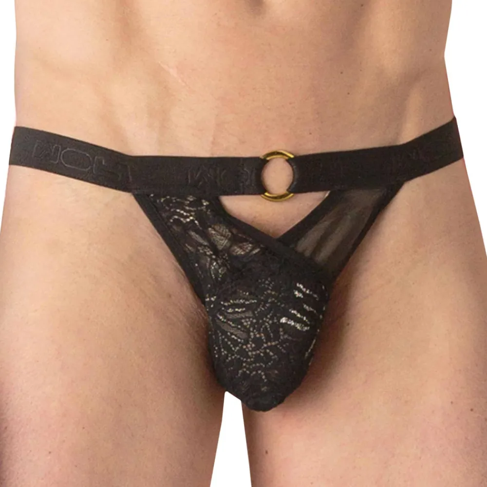 Slip audacieux et élégant en dentelle noir et or et tulle transparent. Design croisé dessinant une découpe provocante au-dessus du pubis et en haut des fesses. Telle un bijou, une boucle dorée décore la fine ceinture élastique signée WOH.