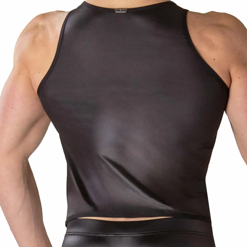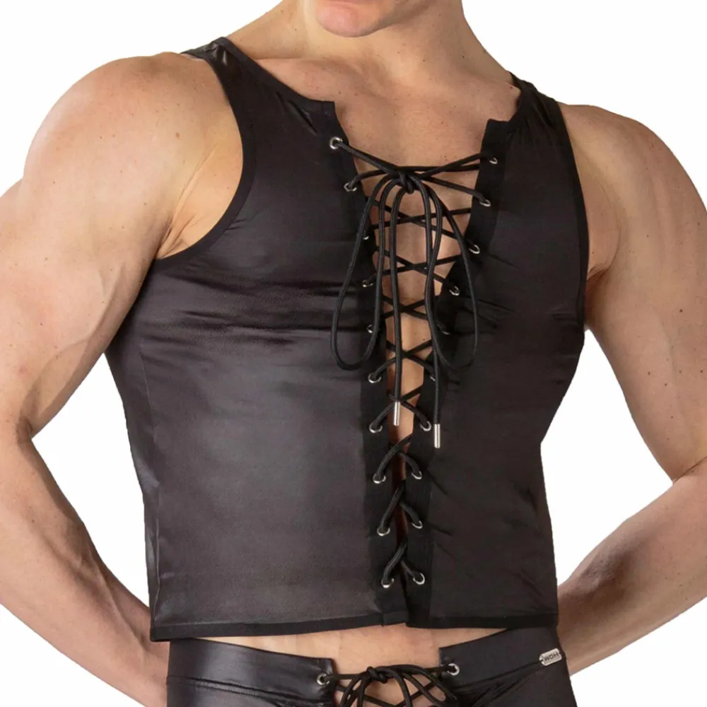 Débardeur sexy et provocant en microfibre extensible imitant le cuir, pour un look fétichiste. Laçage façon corset à l’avant. Petite plaque métallique WOH en haut du dos.